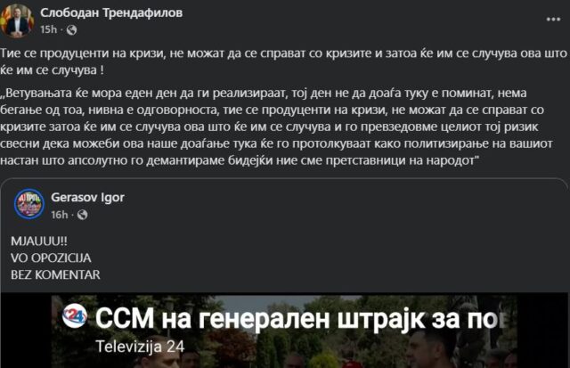 Трендафилов во својата објава истакнува: „Тие се продуценти на кризи, не можат да се справат со кризите и затоа ќе им се случува ова што ќе им се случува“. Тој притоа објавува и транскрипт од тогашниот говор на Стојаноска пред синдикалците кои протестираат: