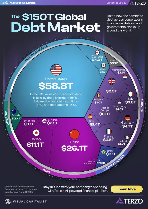 Во првиот квартал од 2025 година, глобалниот пазар на долг достигна 150 трилиони долари – зачудувачка бројка, со оглед на тоа што Светската банка проценува дека глобалниот БДП во 2024 година ќе биде само 111 трилиони долари, што е намалување од речиси 40 трилиони долари.