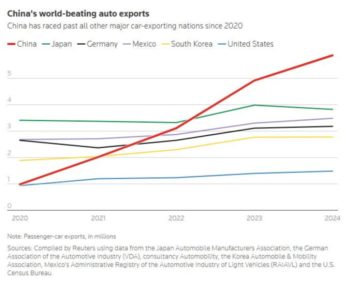 Само извозот на конвенционални автомобили од Кина беше доволен минатата година за да стане најголем извозник на автомобили во светот по обем. Анализата се базира на преглед на Ројтерс на податоците за продажба на автомобили од десетици земји и интервјуа со повеќе од 30 лица, вклучувајќи раководители од 11 кинески и две западни компании.
