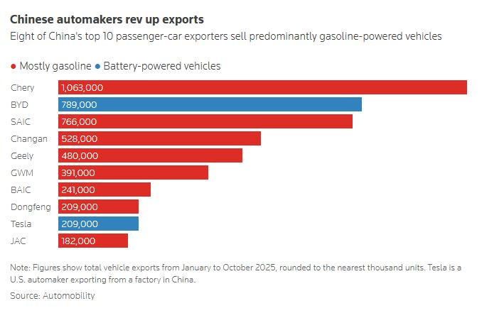 Најголемиот извозник на автомобили во Кина е Chery, чија глобална продажба скокна од 730.000 возила на 2,6 милиони помеѓу 2020 и 2024 година. Chery го зголеми својот годишен извоз во текот на периодот за околу еден милион автомобили – потпирајќи се главно на автомобили на бензински погон, кои сочинуваат четири петтини од неговата продажба. Меѓу 10-те најголеми извозници во Кина се пет други државни производители на автомобили и два приватни, Geely и Great Wall Motor, кои исто така продаваат повеќе конвенционални автомобили отколку електрични.