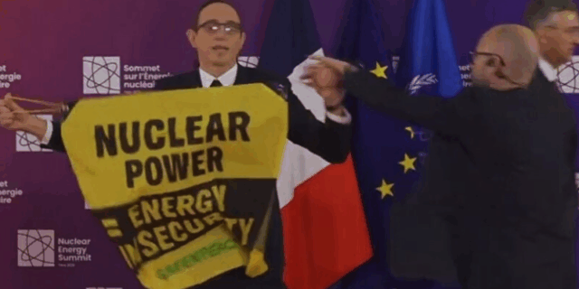Двајца активисти на Гринпис ја нападнаа сцената на почетокот на глобалниот нуклеарен самит во Франција во вторник, прекинувајќи го претседателот Емануел Макрон и шефот на Меѓународната агенција за атомска енергија (МААЕ) Рафаел Гроси додека ги поздравуваа шефовите на државите.