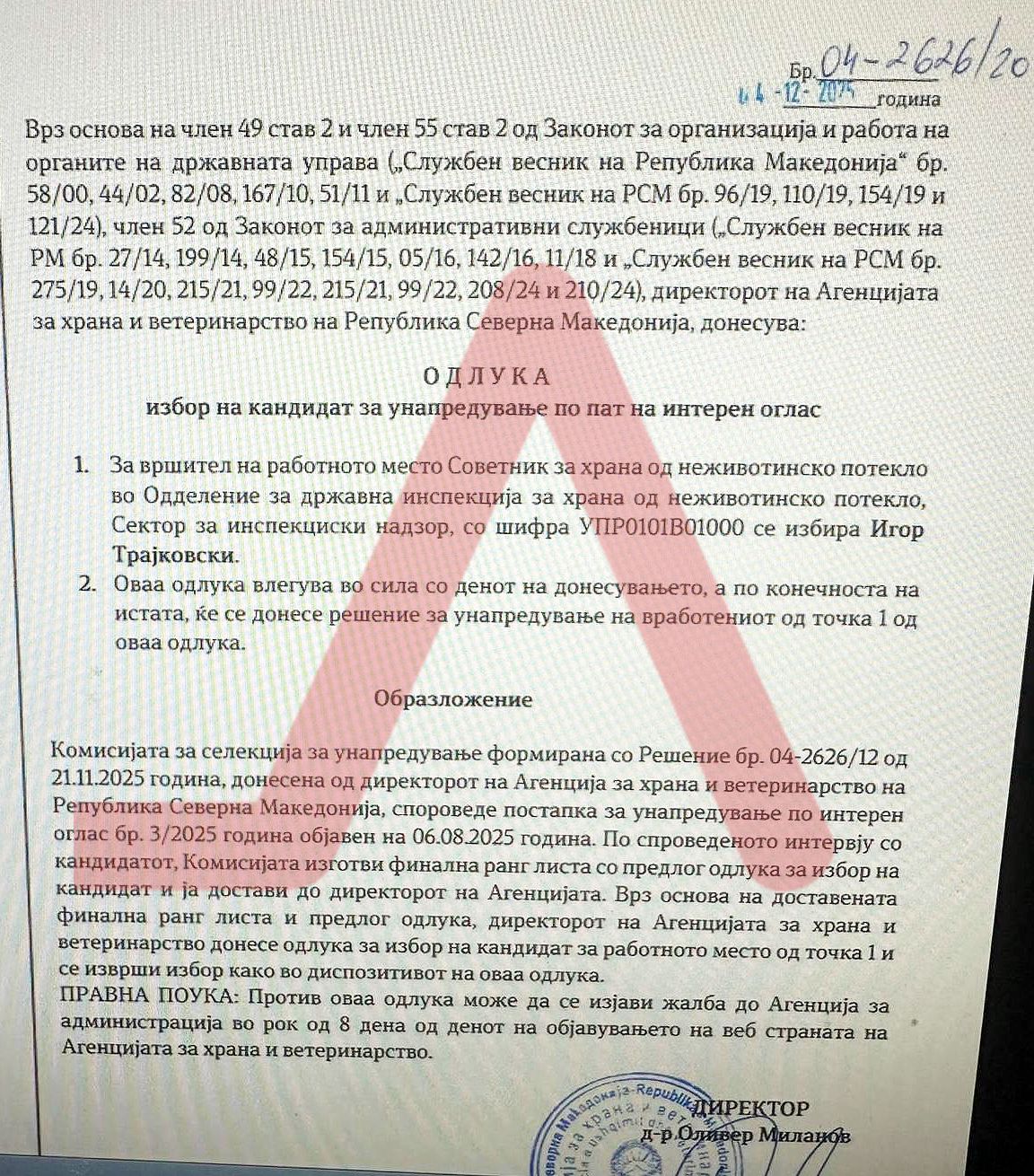 Директорот на Агенцијата за храна и ветеринарство (АХВ), Оливер Миланов го унапредил својот братучед Игор Трајковски.