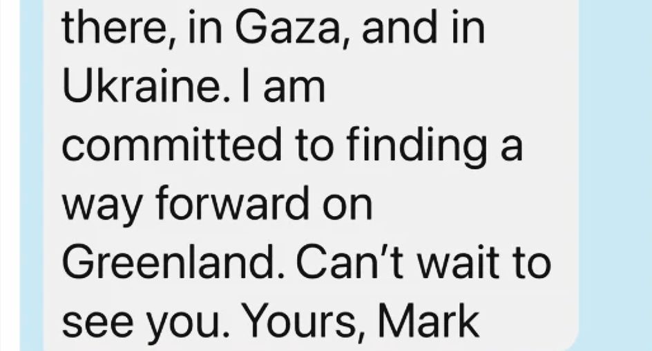„Господине претседателе, драг Доналд, она што го постигнавте денес во Сирија е неверојатно. Ќе ги искористам моите медиумски настапи во Давос за да ја истакнам вашата работа таму, во Газа и во Украина. Посветен сум на наоѓање решение за Гренланд. Едвај чекам да ве видам. Ваш, Марк“, напиша Руте.