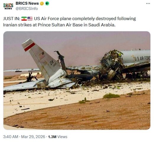 Принтскрин/Х/BRICS News: Американски воен авион E-3 Sentry AWACS, целосно уништен по Ирански напади на воената база „Принц Султан“ во Саудиска Арабија