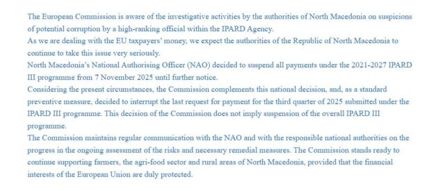 Со оглед на сегашните околности, Комисијата ја надополнува оваа национална одлука и, како стандардна превентивна мерка, одлучи да го прекине последното барање за плаќање за третиот квартал од 2025 година поднесено во рамките на ИПАРД 3 програмата. Оваа одлука на Комисијата не подразбира суспензија на целокупната програма, додаваат од Европската комисија во мејлот испратен преку Делегацијата на ЕУ.