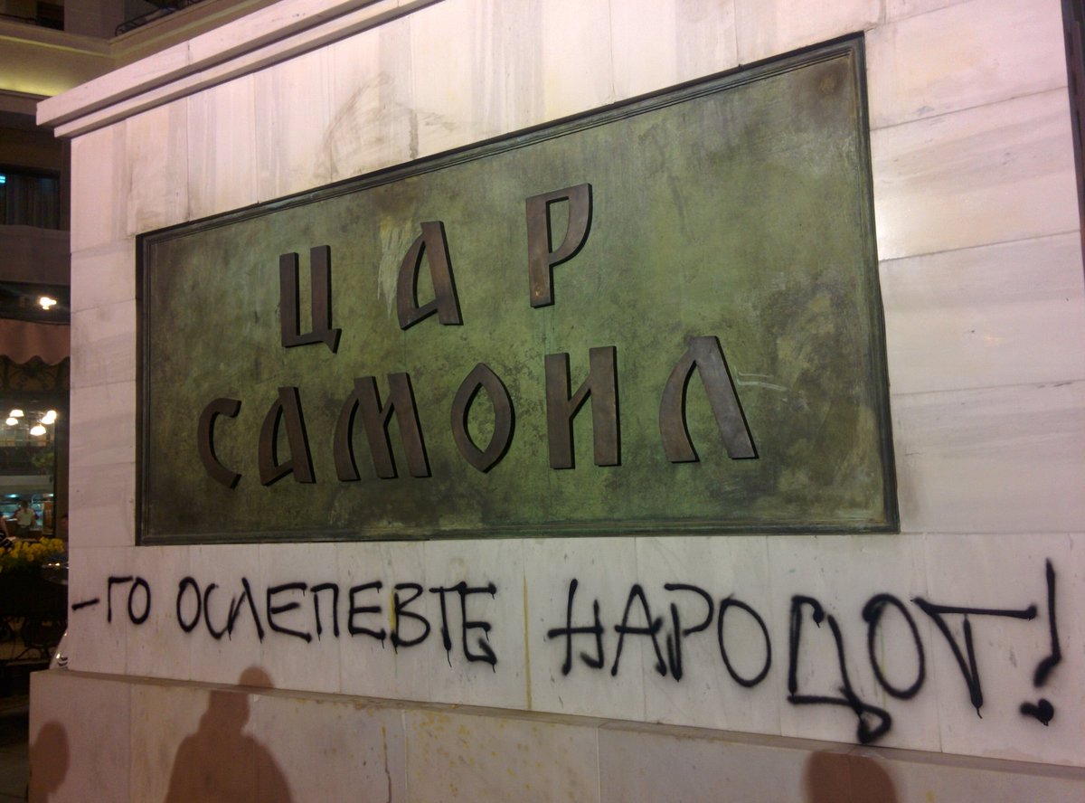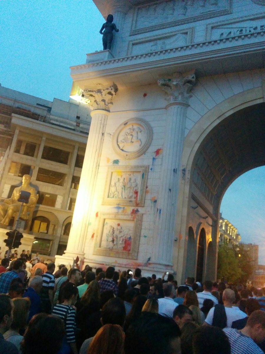 Скопјани во меѓувреме повторно ја гаѓаа и пишуваа пораки на портата на Груевски : „Ружна ви е портата“, „ова Кошта 208 Тамари“ – боја и јајца за триумфалната порта (19:39)