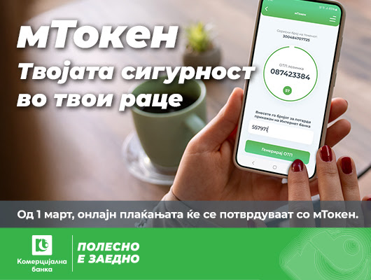 Од 1 март Комерцијална банка (КБ) воведува ново ниво на сигурност при интернет плаќањата со картичка и трансакции преку мБанка. Плаќањата со картичка ќе се потврдуваат со код од мТокен, наместо како досега со потврда со СМС код. Трансакциите преку мБанка, пак, ќе се потврдуваат со ПИН или биометриска автентикација, кои се користат и при најава на апликацијата.