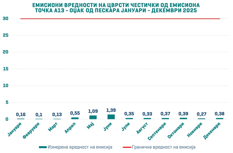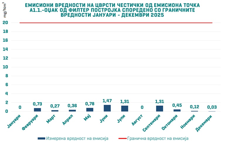 Според редовниот мониторинг на емисиите, кој се спроведува согласно методологии за мерење на стационарни извори, измерените вредности на цврсти честички за месеците октомври, ноември и декември 2025 година покажуваат конзистентно исклучително ниски вредности, кои се во согласност со одредбите од А-интегрираната еколошка дозвола издадена од Министерството за животна средина и просторно планирање како и релевантната законска легислатива.