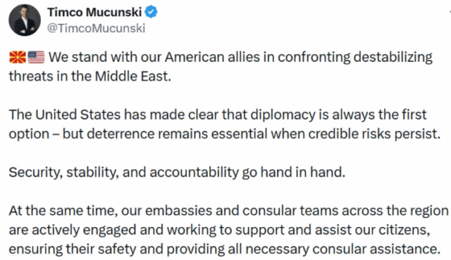 „Соединетите Американски Држави јасно ставија до знаење дека дипломатијата е секогаш првата опција – но одвраќањето останува од суштинско значење кога постојат веродостојни ризици. Безбедноста, стабилноста и одговорноста одат рака под рака“ пишува министерот Муцунски на платформата „Х“.„Истовремено, нашите амбасади и конзуларни тимови низ целиот регион се активно вклучени и работат на поддршка и помош на нашите граѓани, обезбедувајќи ја нивната безбедност и обезбедувајќи ја целата потребна конзуларна помош“ пишува Муцунски додавајќи дека „Исто така, ја потврдуваме нашата целосна солидарност со нашите партнери во Заливот. Нападите врз земјите од Заливот од страна на Иран се неприфатливи и ризикуваат поширока регионална ескалација“.